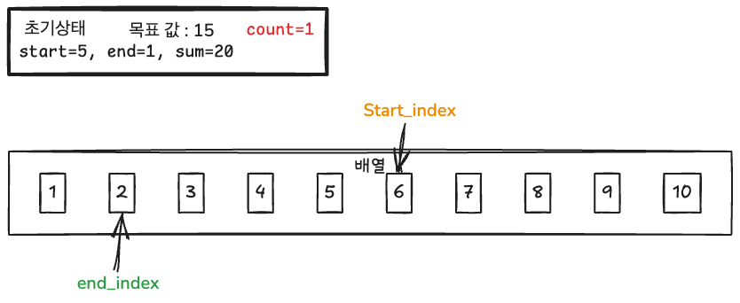 [1] sum < 목표값 → end_index++ [2] sum > 목표값 → start_index++ [3] sum == 목표값 → count++ 후 start_index++